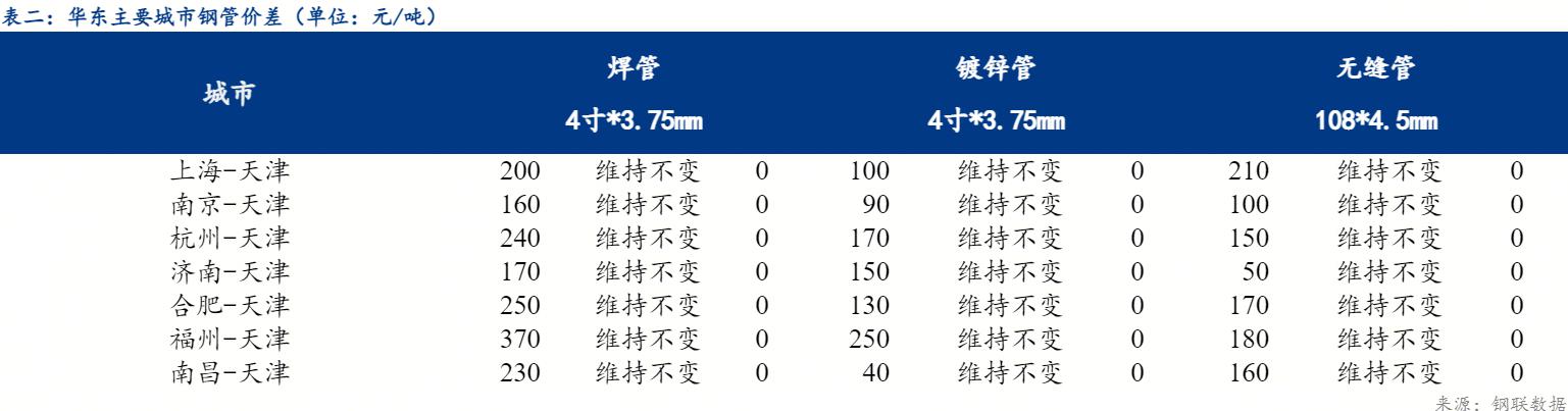 今日华东地区主要城市,较天津市场钢管价差均维持不变。天津市场,华东地区主要市场价格均无变化。