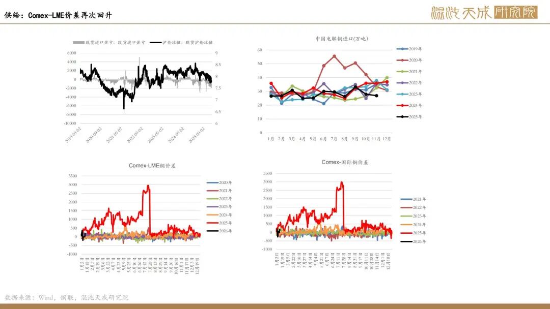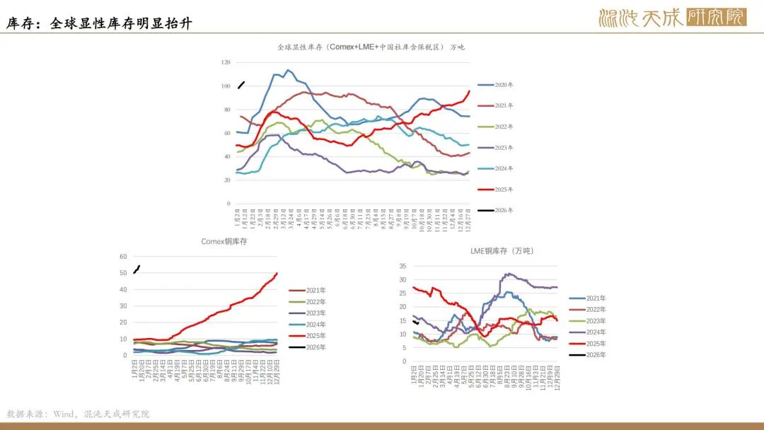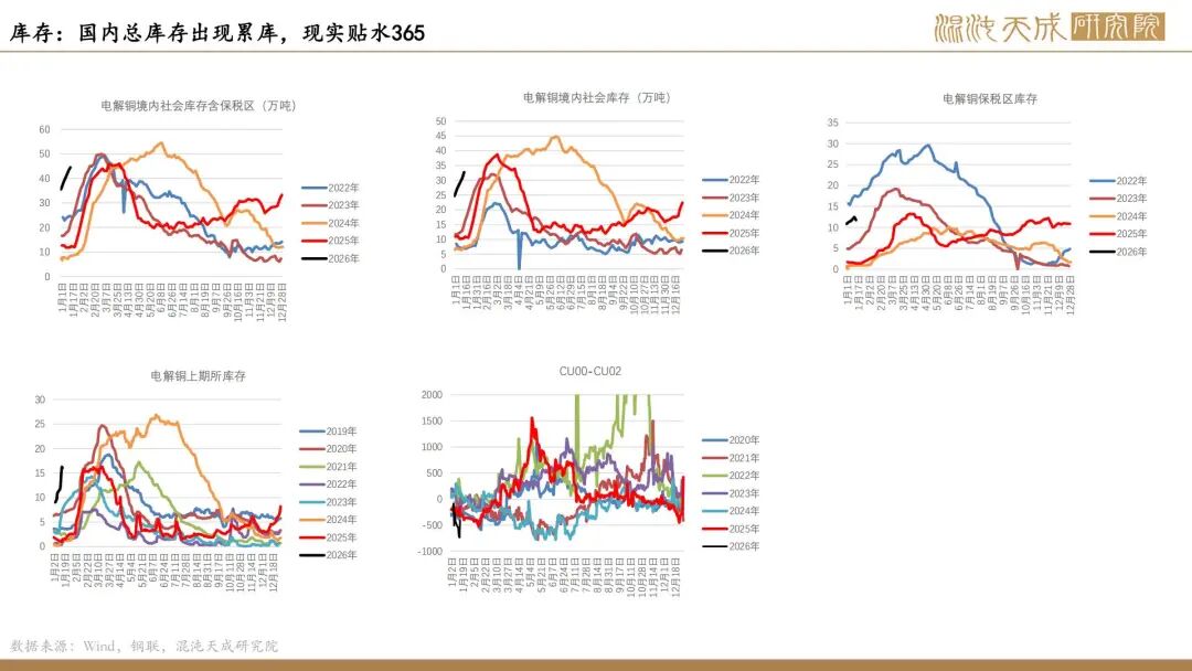 需求端,全球显性库存开始出现回升,LME开始累库,Comex库存高位震荡;截止1月15日国内市场电解铜现货库存32.75万吨,较8日增4.28万吨,较12日增1.99万吨;下游企业经营表现将进一步下滑,库存出现明显累库,贴水也形成实际供需端负反馈。