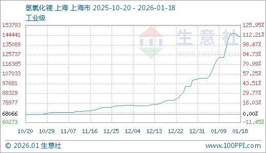 据生意社监测,氢氧化锂01月18日最新价格143000.00元/吨,最近10天上涨19.17%,15天上涨39.06%,20天上涨41.82%,30天上涨74.75%,60天上涨95.80%。