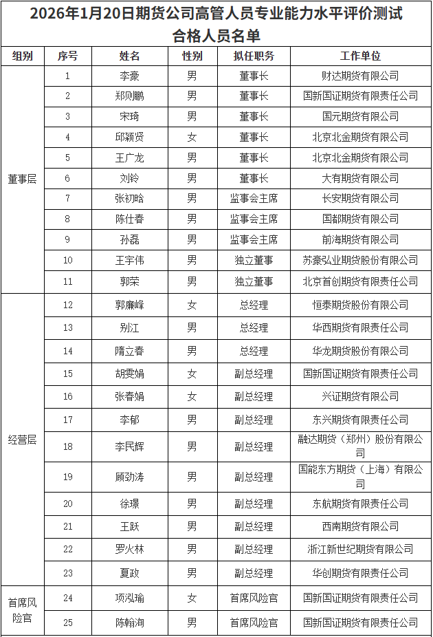 上证报中国证券网讯(记者 费天元)中国期货业协会最新发布“2026年1月20日期货公司高管人员专业能力水平评价测试合格人员名单”,财达期货拟任董事长李豪,国新国证期货拟任董事长郑则鹏,国元期货拟任董事长宋琦,北京北金期货拟任董事长邱颖贤、王广龙,大有期货拟任董事长刘铃通过测试。同时通过测试的还有恒泰期货拟任总经理郭廉峰、华西期货拟任总经理别江、华龙期货拟任总经理隋立春。