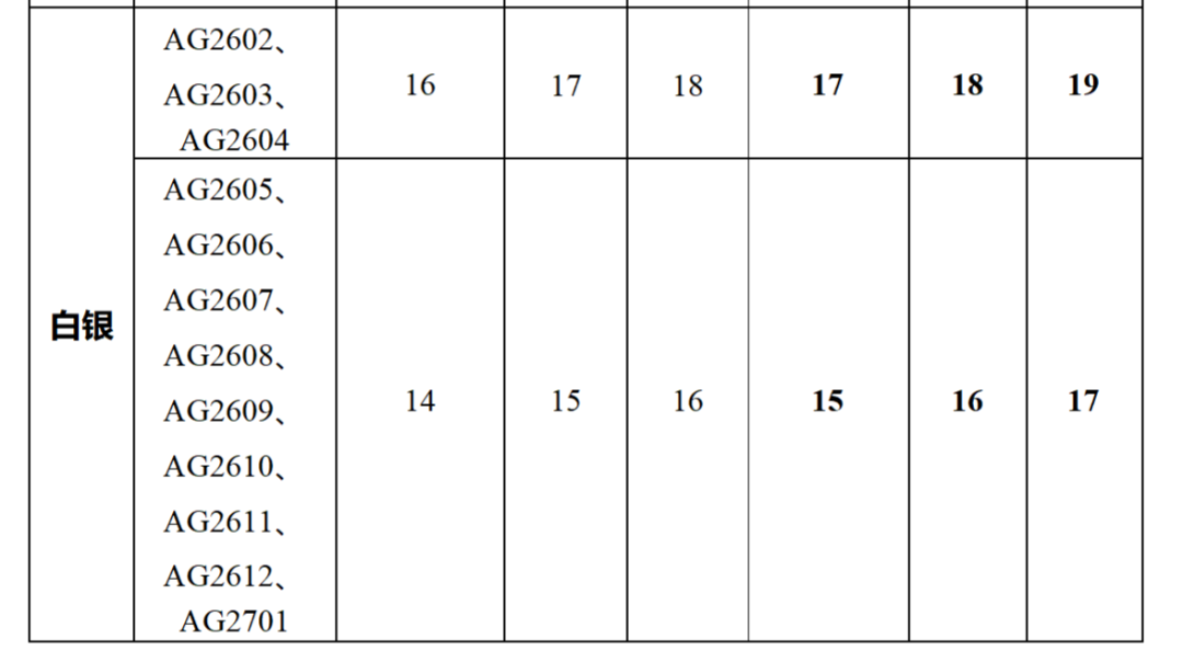 白银期货AG2605、AG2606、AG2607、AG2608、AG2609、AG2610、AG2611、AG2612、AG2701合约涨跌停板幅度调整为15%,套保持仓交易保证金比例调整为16%,一般持仓交易保证金比例调整为17%。