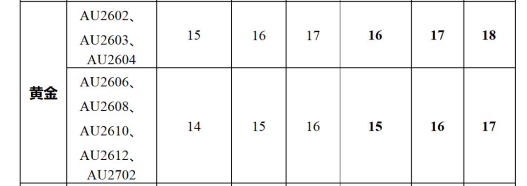 黄金期货AU2606、AU2608、AU2610、AU2612、AU2702合约涨跌停板幅度调整为15%,套保持仓交易保证金比例调整为16%,一般持仓交易保证金比例调整为17%。