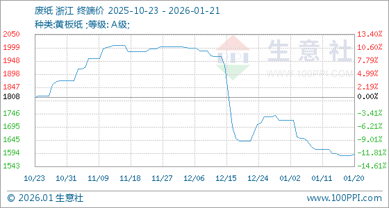 1月21日,生意社废纸基准价为1590.00元/吨,与本月初(1720.00元/吨)相比,下降了7.56%。