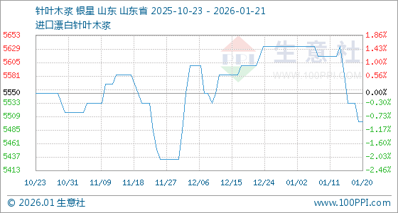 1月21日,生意社针叶木浆基准价为5500.00元/吨,与本月初(5633.33元/吨)相比,下降了2.37%。