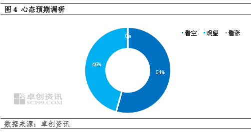 在供需压力仍存,且成本端表现欠佳背景影响下,1月份部分中小纸厂实单实谈,灵活调整自身销售政策,进行让利操作,而规模纸厂多个基地亦下调出厂价,刺激市场看空情绪升温,整体上半月市场承压下行。卓创资讯通过对46家瓦楞及箱板纸中大型纸企调研显示,业者对后市纸价看空心态占比最多。持看空心态的人士占比为54%,较12月末增加23个百分点。