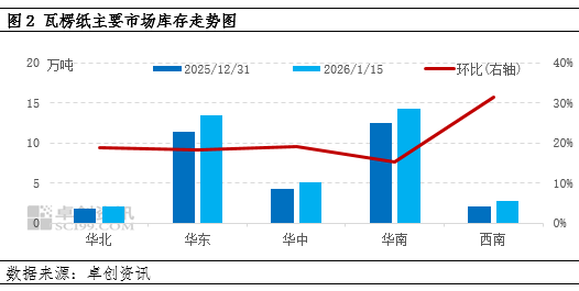 2026年1月中上旬瓦楞纸市场按需成交为主,纸厂库存高位叠加成本利空影响,瓦楞纸市场成交重心下移。下旬春节订单或有一定释放,下游企业备货节奏或提升。但考虑到终端需求或增量有限,叠加成本支撑不大、纸厂库存水平较高,市场价格上涨动力或相对匮乏,维持下滑态势。