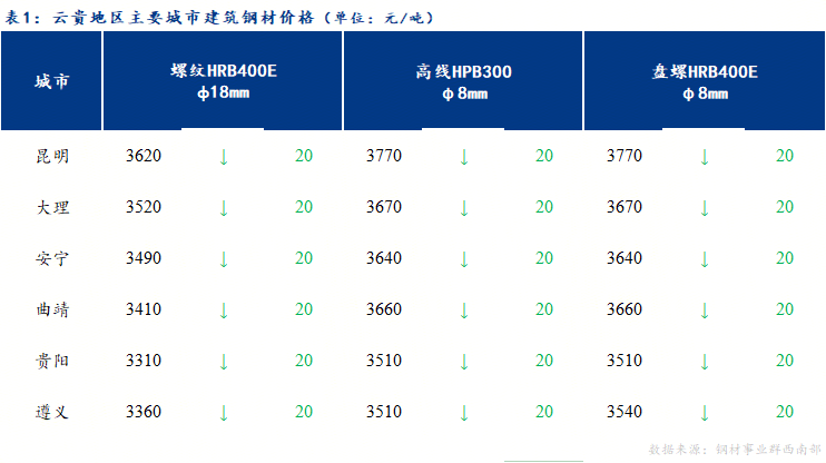 【今日价格】从云贵主要城市建筑钢材价格来看,昆明建筑钢材市场价格跌20元/吨,贵阳建筑钢材市场价格跌20元/吨。