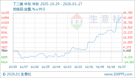 据生意社监测,丁二烯01月27日最新价格10733.33元/吨,最近5天上涨12.00%,10天上涨13.38%,15天上涨17.95%,20天上涨21.05%,30天上涨40.61%,60天上涨52.97%。