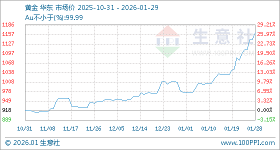 1月29日,生意社黄金基准价为1162.15元/克,与本月初(977.07元/克)相比,上涨了18.94%。