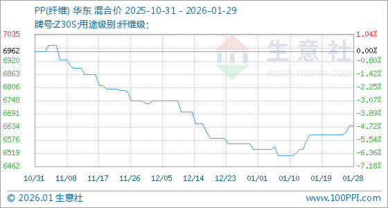 1月29日,生意社PP(纤维)基准价为6637.50元/吨,与本月初(6535.00元/吨)相比,上涨了1.57%。