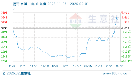 据生意社监测,沥青02月01日最新价格3320.00元/吨,最近5天上涨4.40%,10天上涨6.07%,30天上涨11.66%。