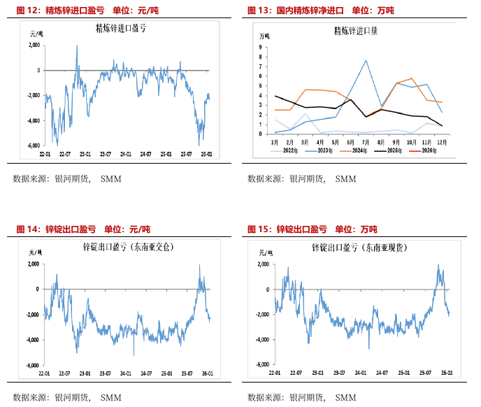 矿端,北方矿山季节性停产及国内部分矿山减产,国产锌精矿供应仍然短缺。进口矿虽有流入,对矿端供应有所补充。但考虑到1月国内锌冶炼厂开工率有所提升,对矿端需求增加,预计国内锌精矿加工费难以出现上调。