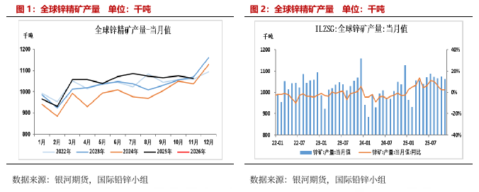 2025年1-11月,全球锌精矿产量为1148.28万吨,同比增加69.33万吨或6.43%;其中海外锌精矿产量为777.18万吨,同比增加58.93万吨或8.2%;中国锌精矿产量371.1万吨,同比增加10.4万吨或2.88%。