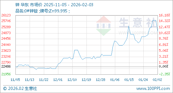 2月3日,生意社锌基准价为24970.00元/吨,与本月初(25776.00元/吨)相比,下降了3.13%。