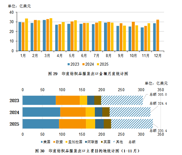 2025年11月,印度纺织品服装出口28.51亿美元,环比增加2.07亿美元,增幅7.83%;同比增加2.64亿美元,增幅10.20%。2025年1-11月,印度纺织品服装出口330.39亿美元,同比增加5.99亿美元,增幅1.85%。