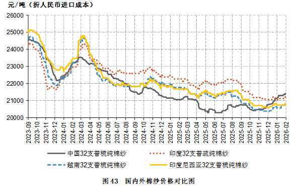 截至1月30日,中国32支普梳纯棉纱21415元/吨,较上月上涨290元/吨;印度32支普梳纯棉纱21212元/吨,较上月上涨75元/吨;越南32支普梳纯棉纱20894元/吨,较上月上涨232元/吨;印度尼西亚32支普梳纯棉纱20814元/吨,较上月下跌8元/吨;巴基斯坦21支普梳纯棉纱19299元/吨,较上月上涨319元/吨(表2、图45)。
