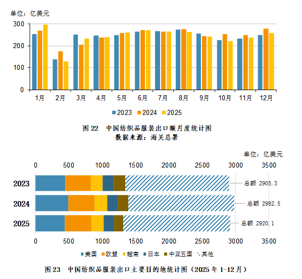 2025年1-12月,中国纺织品服装出口2920.06亿美元,同比减少62.45亿美元,减幅2.09%。其中,纺织品出口1463.25亿美元,同比增加11.02亿美元,增幅0.76%;服装出口1456.82亿美元,同比减少73.46亿美元,减幅4.80%。
