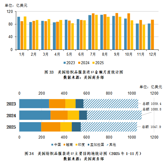 2025年1-11月,美国纺织品服装进口主要来源地为:中国196.31亿美元,占比18.73%;越南171.37亿美元,占比16.35%;印度101.1亿美元,占比9.65%;孟加拉国78.12亿美元,占比7.46%;欧盟60.1亿美元,占比5.74%;柬埔寨48.71亿美元,占比4.65%;墨西哥47.68亿美元,占比4.55%。