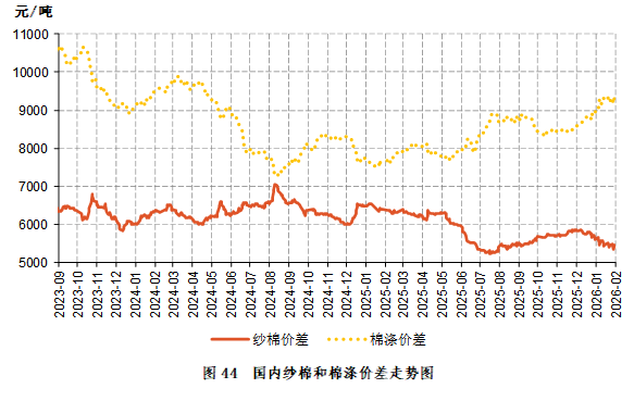 2026年1月,国内棉花、棉纱和化纤价格整体环比上涨,其中,棉价涨幅高于纱价和涤纶短纤,致纱棉价差缩小,棉涤价差扩大。截至1月30日,国内纱棉价差5472元/吨,环比缩小142元/吨;棉涤价差9261元/吨,环比扩大288元/吨(表3、图46)。
