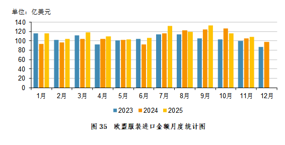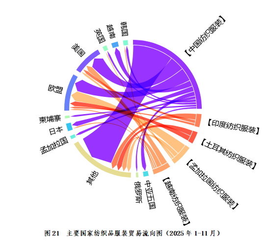 2025年1-11月,欧盟纺织品服装进口主要来源地为:中国395.76亿美元,占比31.27%;孟加拉国207.24亿美元,占比16.37%;土耳其133.07亿美元,占比10.51%;印度75.06亿美元,占比5.93%;巴基斯坦69.83亿美元,占比5.52%;越南54.24亿美元,占比4.29%。