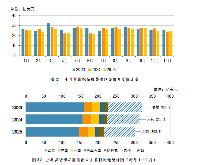 2025年1-12月,土耳其纺织品服装出口主要目的地为:欧盟148.16亿美元,占比48.98%;美国23.58亿美元,占比7.80%;英国20.43亿美元,占比6.75%;中亚五国11.54亿美元,占比3.82%;伊拉克11.45亿美元,占比3.79%。
