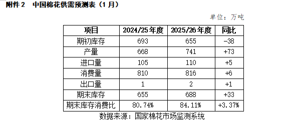 国家棉花市场监测系统2026年1月发布的供需数据显示,2025/26年度全国棉花产量741万吨,同比增加73万吨;消费(883434)量816万吨,同比增加6万吨;期末库存688万吨,同比增加33万吨(详见附件2)。