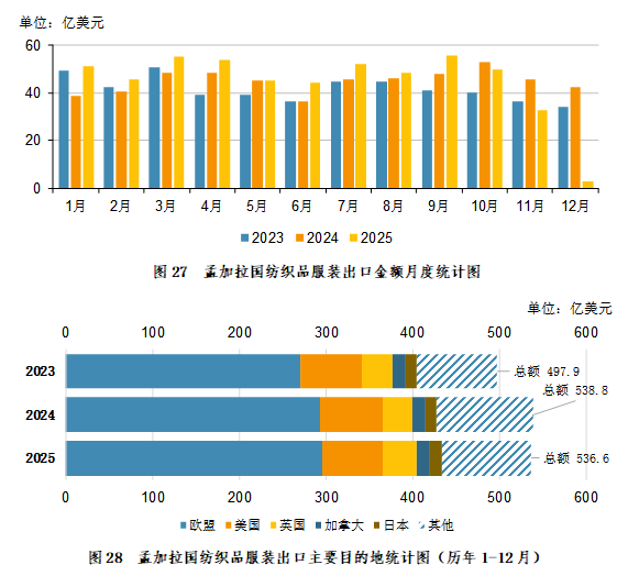 2025年1-11月,孟加拉国纺织品服装出口主要目的地为:欧盟296.25亿美元,占比55.20%;美国69.72亿美元,占比12.99%;英国39.53亿美元,占比7.37%;加拿大15.17亿美元,占比2.83%。