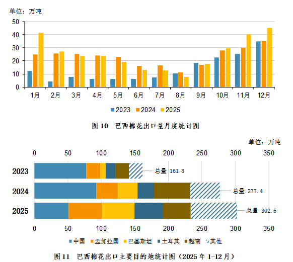 2025年1-12月,巴西棉花出口主要目的地为:中国51.24万吨,占比16.93%;孟加拉国49.76万吨,占比16.44%;巴基斯坦48.77万吨,占比16.12%;土耳其42.25万吨,占比13.96%;越南41.69万吨,占比13.78%;印度25.13万吨,占比8.30%;印度尼西亚17.66万吨,占比5.84%。