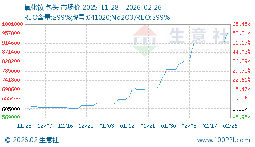 据生意社监测,氧化钕02月26日最新价格965000.00元/吨,最近5天上涨5.46%,20天上涨15.92%,30天上涨28.24%,60天上涨54.40%。