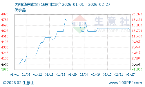 2026年2月,丙酮市场呈总体下行态势,价格较月初小幅回落,核心因供应充裕叠加需求复苏不及预期,市场处于供需宽松状态,价格呈现“高位回落、月末窄幅微调”特征。2月丙酮价格延续1月高位回落态势,下行幅度温和,区域差异较小。据生意社数据,2月27日丙酮基准价4605.00元/吨,较月初(4700.00元/吨)下降2.02%,当前处于近一年中低位,仅高于全年最小值4047.50元/吨557.5元/吨。