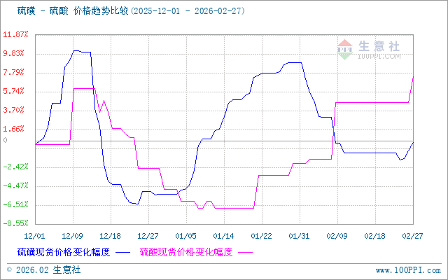 2026年前两月,国内硫酸市场延续2025年强势格局,整体涨势良好,价格稳步攀升、区域分化,核心依托成本高位、供应偏紧与下游刚需共振,呈现“供紧需稳、价涨量稳”特征,成为开年化工(850102)市场亮点品种。