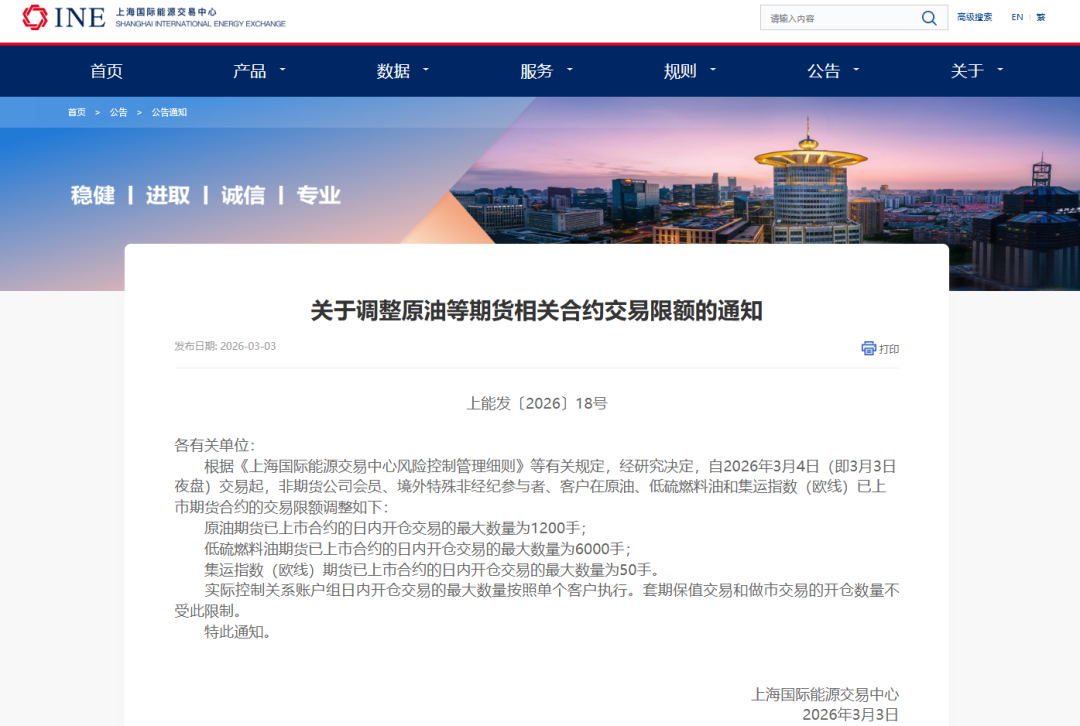 3月3日,上海期货交易所(以下简称上期所)发布通知称,自2026年3月4日(即3月3日夜盘)交易起,非期货公司会员、境外特殊非经纪参与者、客户在原油、低硫燃料油和集运指数(欧线)已上市期货合约的交易限额调整如下: