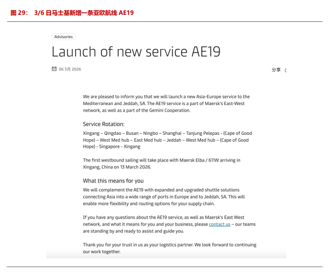 船司开始进行航线调整,原部署在中东航线的集装箱船KHORFAKKAN和CSCL Atlantic(ATLN) OCEAN调配至欧线,另外有船舶计划调配至印度和地中海等航线,短期可能冲击其他航线供需格局。2026年3月6日,MSK宣布已决定暂时停运连接远东与中东的FM 1干线,以及连接中东与欧洲的ME11干线,宣布新增一条新的亚欧航线AE19,连接地中海及沙特阿拉伯吉达港。