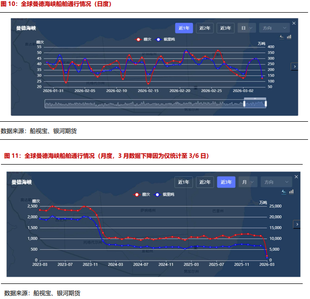 曼德海峡自红海事件发生后,船舶通行量较红海危机前减少7成。曼德海峡方面,自2023年红海危机开始,主流船司已经开启绕航好望角的策略,尽管目前美伊局势升级,霍尔木兹海峡被封锁后,曼德海峡的船舶通行量暂时未出现大幅下滑,但后续仍需要持续关注胡塞武装对于红海过路船舶的打击情况是否会影响至曼德海峡。红海危机发生前后,曼德海峡的通行量减少7成。从船视宝最新的数据来看,截至2026年3月5日,该地区的船舶通行量为28艘,共计139.1万吨,与去年阶段2月-3月的20-50艘的船舶通行量大体一致。
