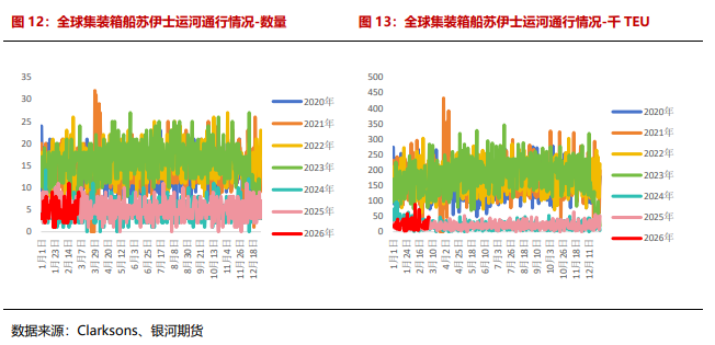 而另外两大船型,干散货船和油轮过路苏伊士运河的数量依旧与去年同期相当,后续需要持续关注美伊冲突局势恶化是否持续外溢至临近的苏伊士运河的通行情况。