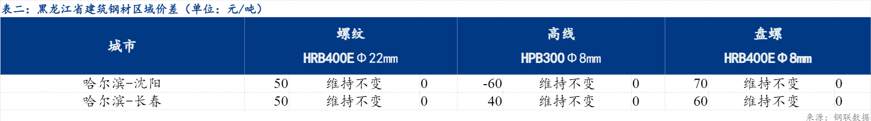 今日哈尔滨与沈阳价差螺纹维持不变,价差为50元/吨;哈尔滨与长春螺纹价差维持不变,价差为50元/吨,哈尔滨与沈阳盘螺价差维持不变,价差为70元/吨。哈尔滨与长春盘螺价差维持不变,价差为60元/吨。