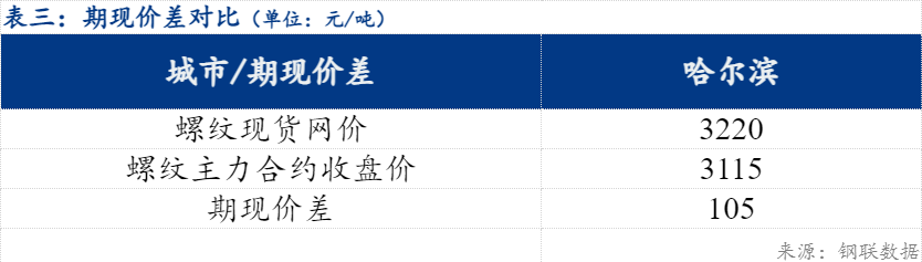 今日期螺主力收盘价格3115元/吨,期现价差105元/吨。