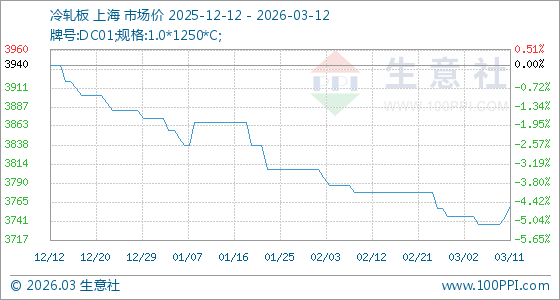 3月12日,生意社冷轧板基准价为3760.00元/吨,与本月初(3747.50元/吨)相比,上涨了0.33%。
