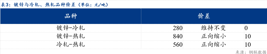 今日南京-上海1.0mm冷轧价差100元/吨,南京-上海1.0mm镀锌价差60元/吨;南京-合肥1.0mm冷轧价差-20元/吨,南京-合肥1.0mm镀锌价差380元/吨;品种价差方面:镀冷价差280元/吨,镀热价差840元/吨,冷热价差560元/吨。