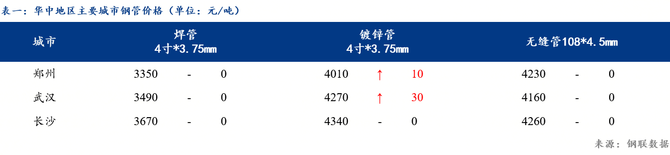 今日价格,焊管、镀锌管方面,华中市场焊管均持稳运行,郑州、武汉镀锌管分别上涨10、30元/吨,长沙市场镀锌管价格暂稳;无缝管方面,华中市场无缝管价格均持稳运行。