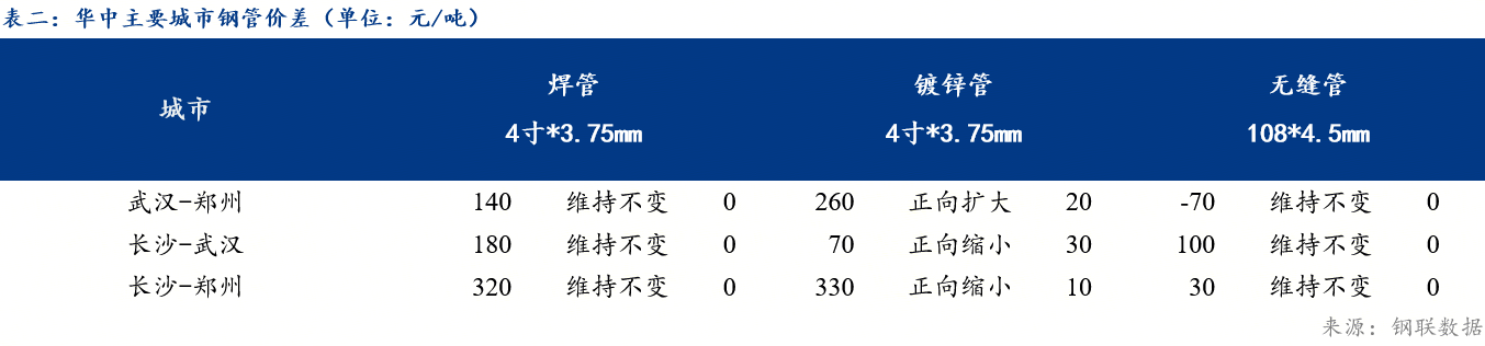 今日价差,焊管、镀锌管方面,华中市场焊管价差均维持不变,武汉与郑州市场镀锌管价差扩大20元吨,长沙与武汉市场镀锌管价差缩小30元/吨,长沙与郑州市场镀锌管价差缩小10元/吨;无缝管方面,华中市场无缝管价差均维持不变。