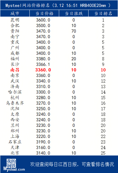 12日南昌螺纹钢(20mmHRB400E)排名较上一工作日上升1位,排名位列25个城市第10名。