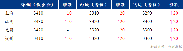 昨日,上海中板价格上涨10-20元/吨。主流低合金报价3410-3420元/吨,主流普板报价3290-3320元/吨。