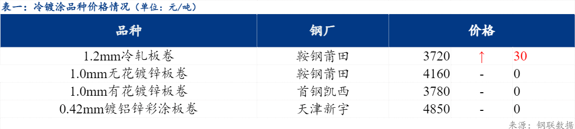 市场方面,福州市场冷轧板卷1.2mm主流报价3720元/吨,较上一交易日上涨30元/吨;无花镀锌1.0mm报价4160元/吨,较上一交易日持平;有花镀锌1.0mm报价3780元/吨,较上一交易日持平;镀铝锌彩涂板卷天津新宇0.42mm报价4850元/吨,较上一交易日持平。