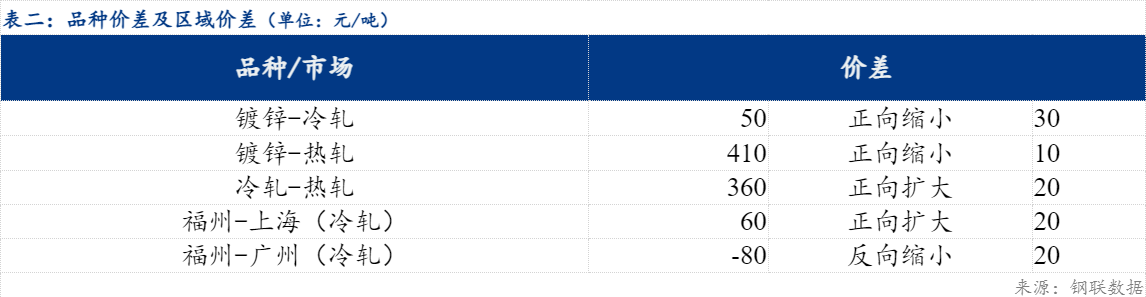 品种价差来看,镀冷价差50元/吨,较上一交易日正向缩小30元/吨;镀热价差410元/吨,较上一交易日正向缩小10元/吨;冷热价差360元/吨,较上一交易日正向扩大20元/吨。区域价差来看,冷轧品种,福州-上海价差60元/吨,较上一交易日正向扩大20元/吨;福州-广州价差80元/吨,较上一交易日反向缩小20元/吨。