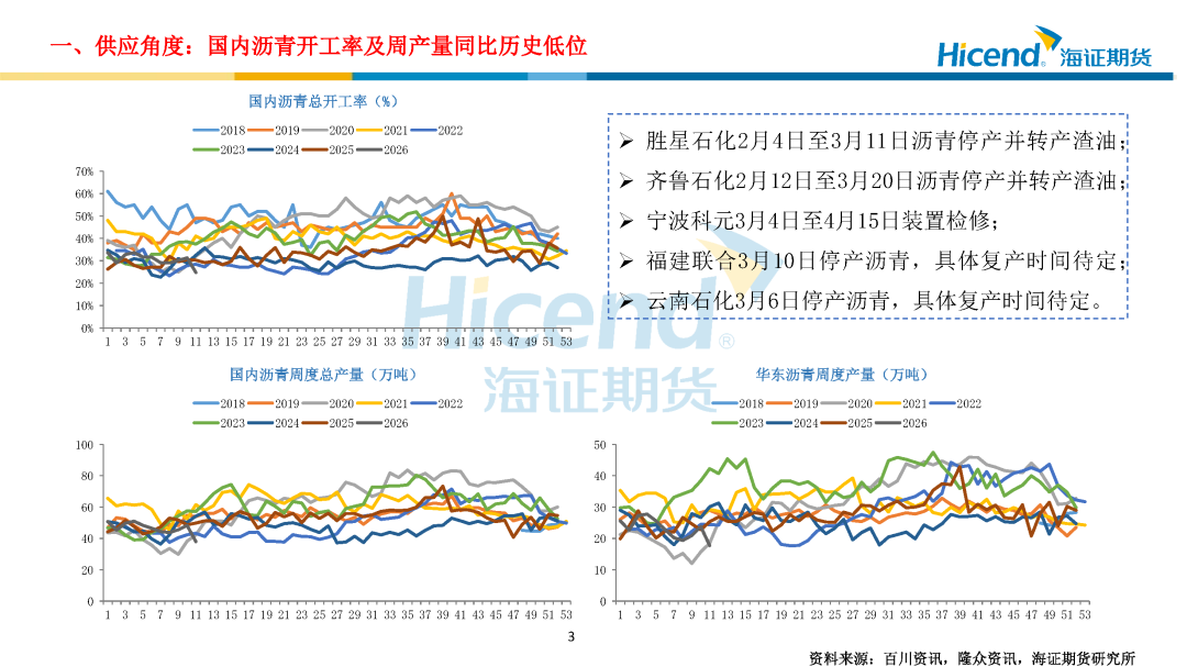 供应端:截至3月13日当周,沥青开工率周环比下降6.51个百分点至24.75%;沥青周产量环比下降10.39万吨至37.94万吨。胜星石化2月4日至3月11日沥青停产并转产渣油;齐鲁石化2月12日至3月20日沥青停产并转产渣油;宁波科元3月4日至4月15日装置检修;福建联合3月10日停产沥青,具体复产时间待定;云南石化3月6日停产沥青,具体复产时间待定。受美以伊冲突影响,沥青高估值持续大幅回落至低位,多数炼厂生产原料受到不同程度影响,山东中石化主营炼厂沥青保持停产停销,主力地炼沥青减产并限量发货,其他多数地炼沥青亦保持低产或停产。