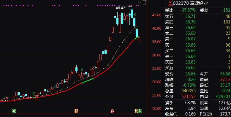 章源钨业(002378)作为国内钨产业链完整的龙头企业,覆盖采矿、冶炼及深加工全环节,拥有4座采矿权矿山,钨资源储量占全国约5.33%。2026年以来,该公司股价大幅上行,从最低约14.16元/股,涨至3月中旬最高48.42元/股,涨幅超过240%。