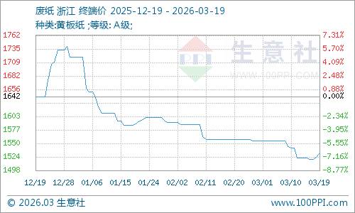 据生意社商品行情分析系统监测:本周内纸厂废纸价格止跌回升,3月19日浙江地区废黄板纸A级收购价格均价为1532元/吨,与3月15日均价相比上涨了0.66%。瓦楞纸价格在平稳过后迎来上涨走势,3月19日瓦楞原纸140g出厂价格均价为2806元/吨,与3月15日均价相比上涨了1.52%。