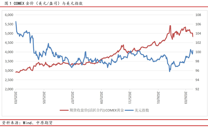在本轮地缘冲突中,贵金属(881169)价格走势与市场预期出现一定背离,核心原因是市场交易逻辑 已从“避险需求”转向“通胀预期与货币政策”的博弈。随着美原油价格快速重新站上100美 元/桶,市场开始担心高油价将会导致美联储维持更久的高利率,通胀反弹的预期使得年内美联 储降息预期不断降温。因此美元指数走强、美债短端收益率上行,使得黄金作为无息资产面临 更高的持有成本,对黄金价格形成了直接利空。另外,本次中东地缘冲突直接导致原油价格大 涨,和原油深度绑定的美元重新获得溢价,黄金对美元的替代需求也出现一定回落。因此,黄金阶段性避险属性难以抵消美元和美债利率上行带来的利空影响。