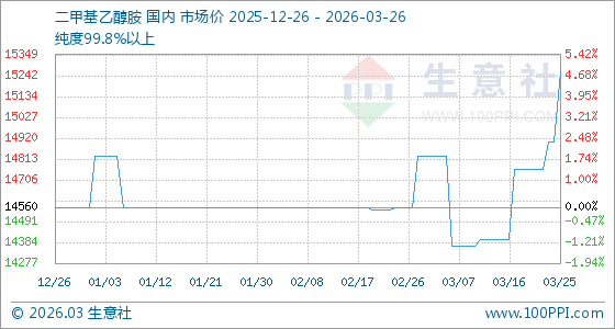 3月26日生意社二甲基乙醇胺基准价为15260.00元/吨